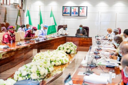 Hon. Minister of Works & Housing, Mr Babatunde Fashola,SAN (2nd left), Minister of State in the Ministry, Engr. Abubakar Aliyu (7th right), Acting Permanent Secretary, Ministry of Works and Housing, Engr. Yemi Oguntominiyi (left), Managing Director, Federal Roads Maintenance Agency (FERMA), Engr. Nuruddeen Rafindadi (6th right) ,Corps Marshal of the Federal Road Safety Corps (FRSC) , Dr Boboye Oyeyemi (3rd 5th right) and others during a Special Meeting on the Partial Closure of the Third Mainland Bridge to discuss Traffic Diversion/Provision of Alternative Routes for Ease of Movement for Road Users within the Lagos Metropolis at the Ministry of Works and Housing Headquarters, Mabushi, Abuja on Tuesday, 14th July 2020.