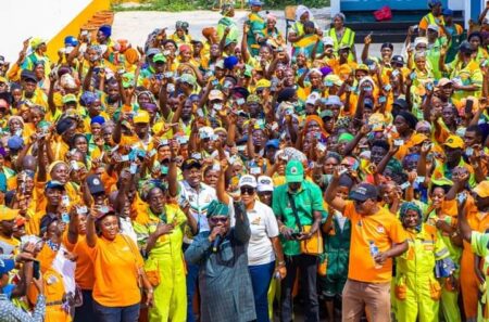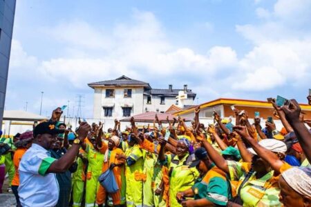 Sanwo-Olu Increases Sanitation Workers’ Salary • sweepers show PVCs in readiness to vote