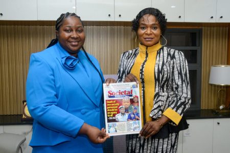 Managing Director, Executive Trainers Ltd, Dr. Mrs. Ajoke Ogunsan being presented copy of the Societal Concerns Magazine from the Publisher, Societal Concerns Magazine, Amb. Oluwayomi Oluwapelumi during the courtesy visit of Societal Concerns Team to Dr. Mrs. Ogunsan…