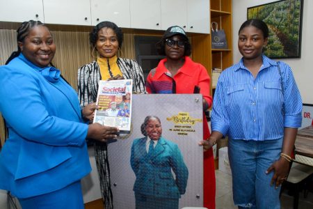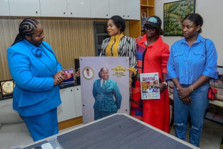 Publisher, Societal Concerns Magazine and her team unveiling the Special Portrait Frame as Dr. Mrs. Ajoke Ogunsan looks on during their visit to her office…