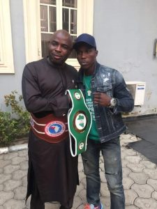 L-R: Chairman, Somolu Local Government, Hon. Abdul Hamed Salawu with the Somolu-born African boxing Champion, Riliwan ‘Showboy’ Lawal