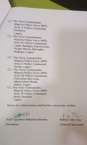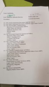 Below are the copies of the Letter from the NURTW National President, Alhaji Tajudeen Baruwa in Abuja to the new Chairman, TOOAN Lagos State, Alh Abiola Azeez, Istijabah made available to Trek Africa Newspaper;