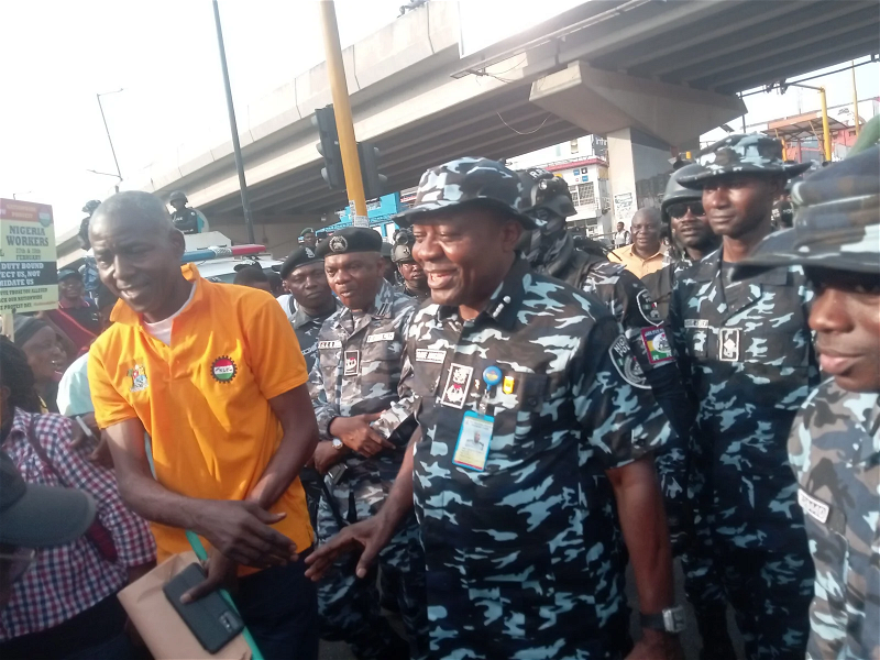 L-R: Commissioner of Police, Lagos Command, CP Adegoke Fayoade (m); Deputy Commissioner of Police, DC Operations, DCP Fatai Tijani (2nd right) during the Nigeria Labour Congress (NLC) Protest Walk in Lagos.