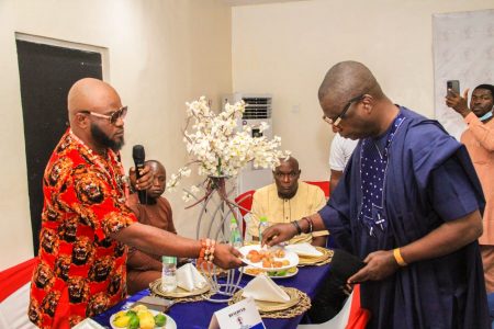 L-R: HRH. Hon. Igwe Ama Kelvin Etonihu, Oputa Obie Presenting Kolanut to Mr. Poly Chinenye Ezumoha (PolySamez) at the Doable 2023 Critical Stakeholders Canvass in Lagos