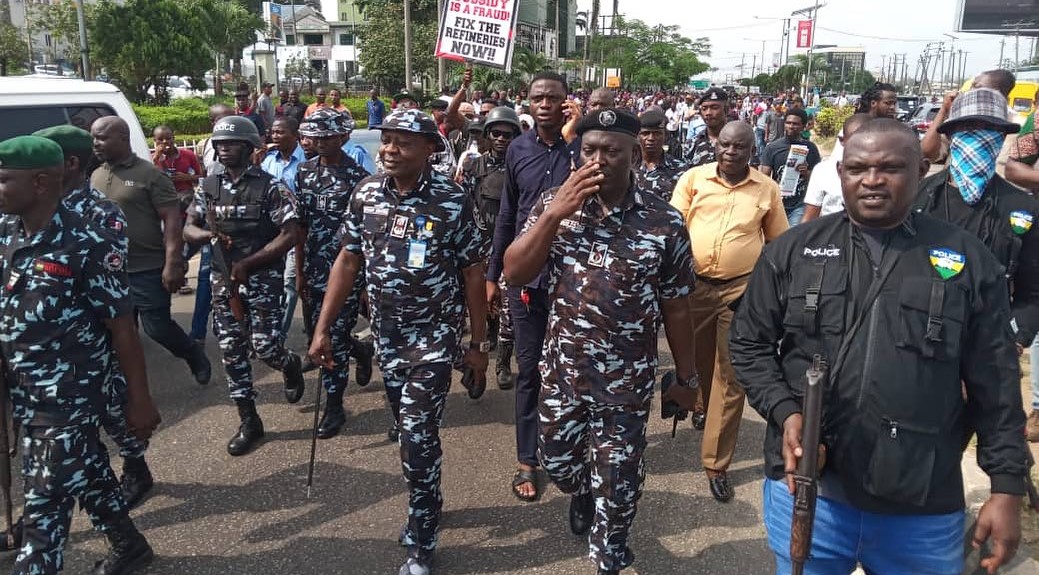 Commissioner of Police, Lagos Command, CP Adegoke Fayoade (m); Deputy Commissioner of Police, DC Operations, DCP Fatai Tijani (2nd right) during the protest of the Nigeria Labour Congress (NLC) in Lagos.