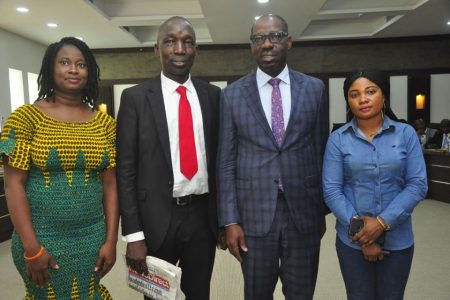 R-L: Edo Correspondent, Nigeria NewsDirect, Eunice Odigie; Edo State Governor, Mr. Godwin Obaseki; Publisher/Editor in Chief, Nigeria News Direct, Dr. Samuel Ibiyemi; Editor, Nigeria NewsDirect, Abuja, Agatha Chitumu, after presentation of 2019 Best Governor of the Year 2019 award to Governor Obaseki, by the newspaper at the Government House, Benin City, on Wednesday, February 19, 2020.