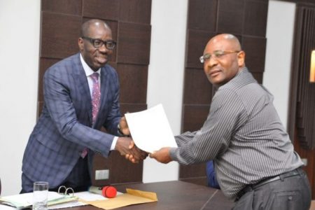 Edo State Governor, Mr. Godwin Obaseki, receiving the notification of Daily Independent’s Governor of the Year Award from Editor, Daily Independent, Mr. Don Okere, during the State’s Weekly Executive Council (EXCO) meeting held in Government House, in Benin City, the Edo State Capital, on Wednesday, February 19, 2020.