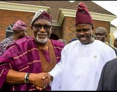 L-R: Gov Rotimi Akeredolu in a warm handshake with Senator Ibikunle Amosun